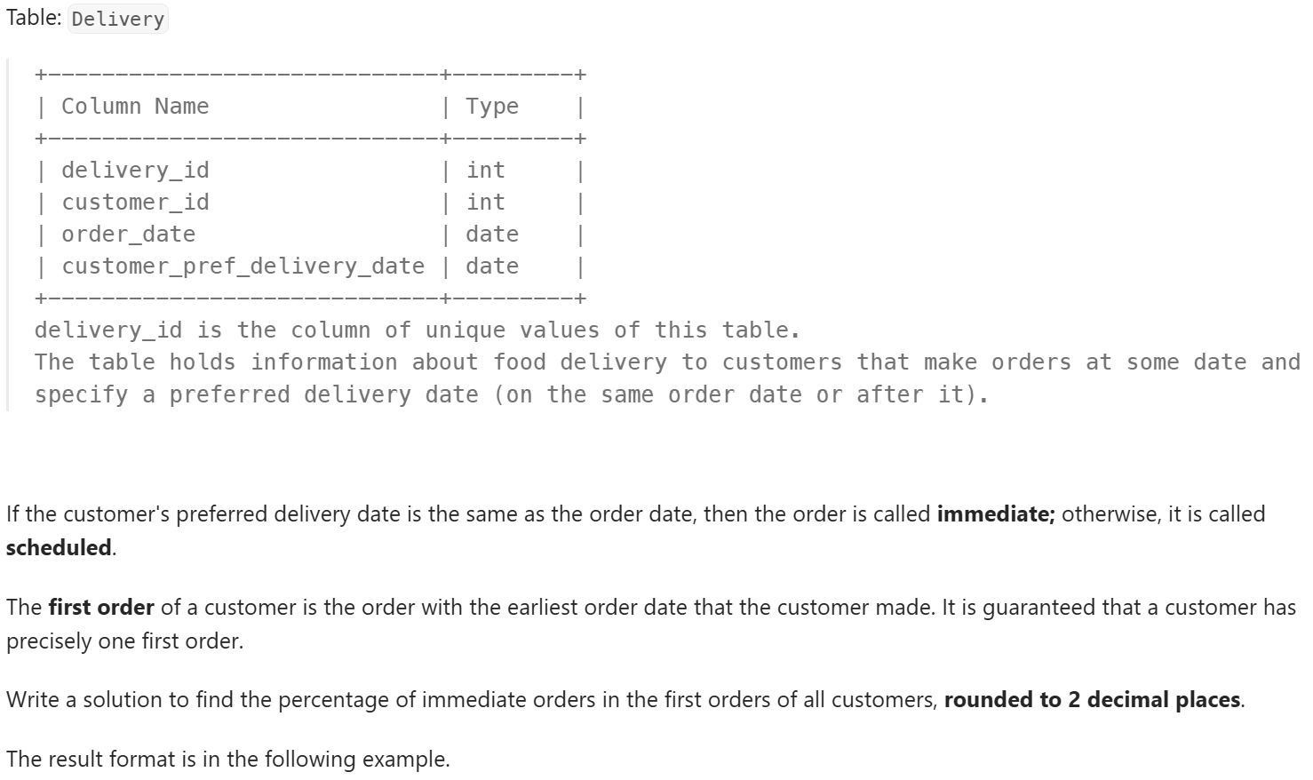 SELECT ROUND(AVG(order_date = customer_pref_delivery_date) * 100, 2) AS immediate_percentage