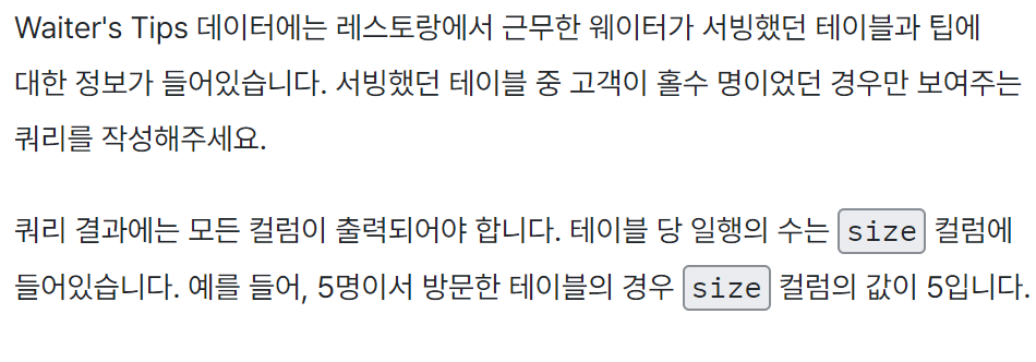 문제에서는 Waiter's Tips라는 데이터래서 full-name을 적었더니 해당 데이터는 없다고 나왔다. 혹시 Tips인가? 해서 해봤더니 데이터가 출력되었다. 여기서 배운점은 확실히 제출전에 실행해보는 것이 좋은것 같다.