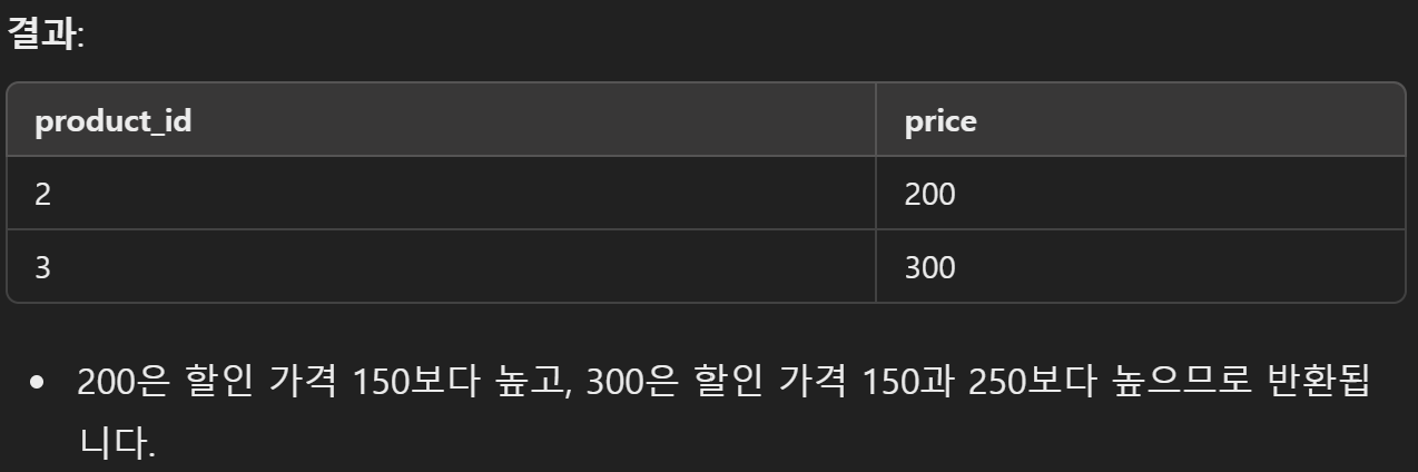 문제: Products 테이블에서 가격이 하나라도 높은 할인 가격이 있는 상품 찾기.