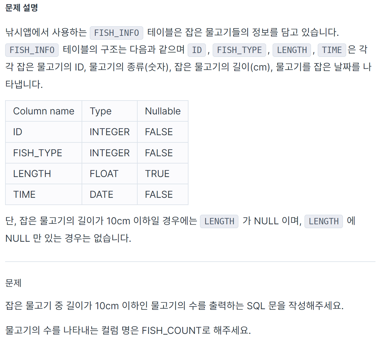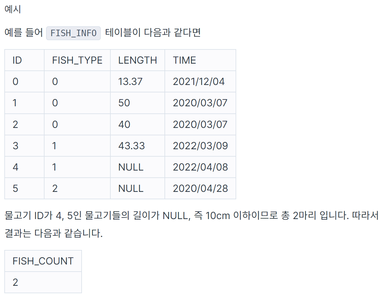 문제에서 10cm 이하인 물고기는 LENGTH가 NULL로 기록된다고 하므로 NULL의 개수만 출력하면 된다.