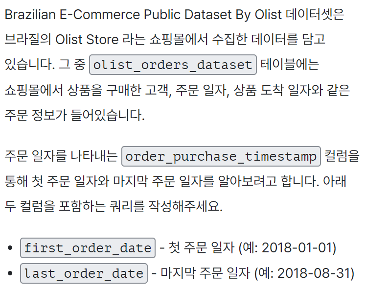 SUBSTR(MIN(order_purchase_timestamp), 1, 10) AS first_order_date,