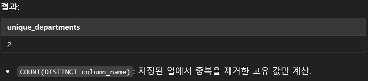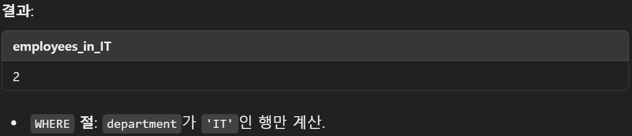 - COUNT는 WHERE 절과 함께 사용하여 특정 조건을 만족하는 행 개수를 셀 수 있습니다.