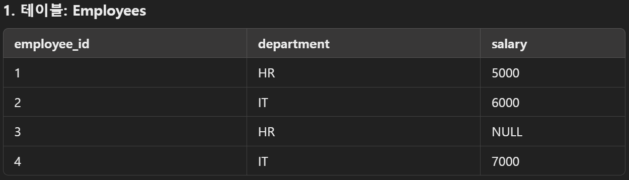 - COUNT(*)를 사용하면 NULL 값을 포함한 모든 행을 셉니다.