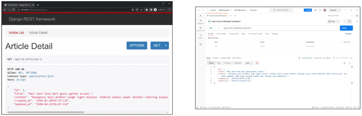똑같은 데이터를 HTML에 출력되도록 페이지와 함께 응답했던 과거의 view 함수, JSON 데이터로 serialization 하여 페이지 없이 응답하는 현재의 view 함수입니다.