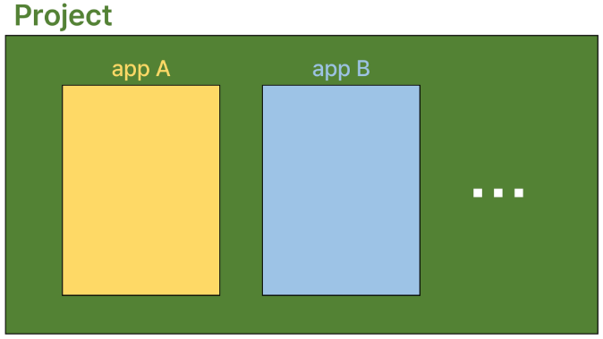 쉽게 설명하자면, 프로젝트는 카페로 전체 설정을 담당하고 앱은 게시글, 댓글, 회원 관리등으로 DB, 로직, 화면입니다.