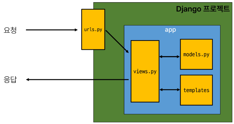 Django에서 애플리케이션을 구조화하는 패턴으로 기존 MVC 패턴과 동일하지만 명칭을 다르게 정했습니다.