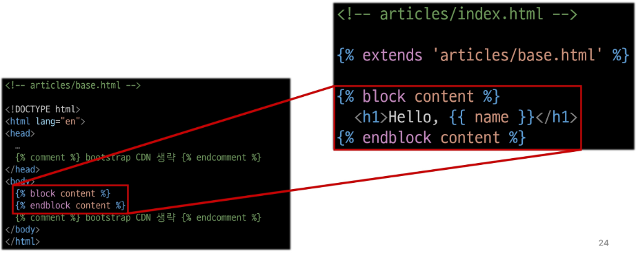 이 한계를 극복하기 위해 템플릿 상속(Template inheritance)를 Django에서는 적용하고 있습니다. 페이지의 공통요소를 포함하고, 하위 템플릿이 재정의 할 수 있는 공간을 정의하는 기본 ‘skeleton’ 템플릿을 작성하여 상속 구조를 구축합니다.