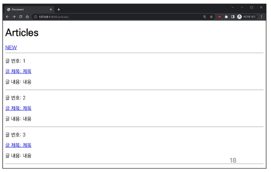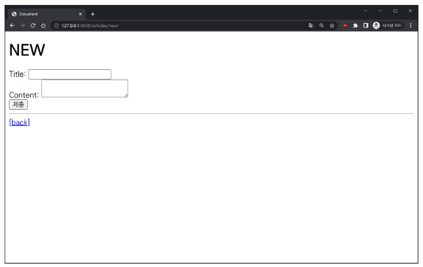 Create 로직을 구현하기 위해 필요한 view 함수의 개수는 몇 개일까요? 사용자 입력 데이터를 받을 페이지를 렌더링 하는 new와 사용자가 입력한 데이터를 받아 DB에 저장하는 create, 이렇게 두 가지가 있습니다.