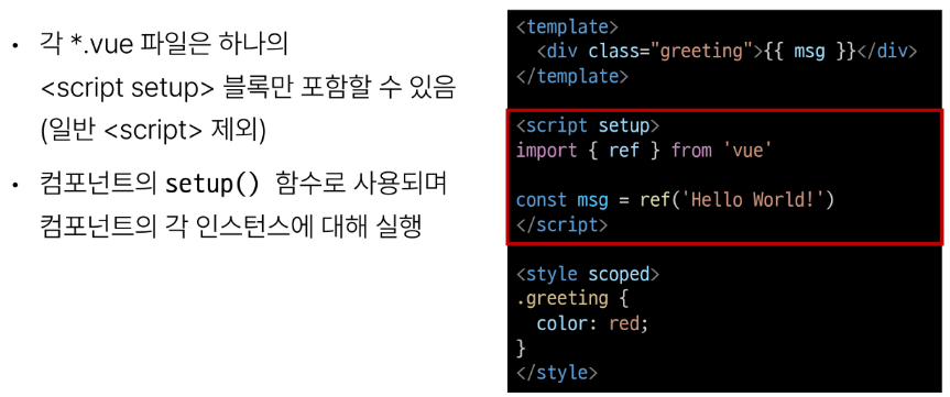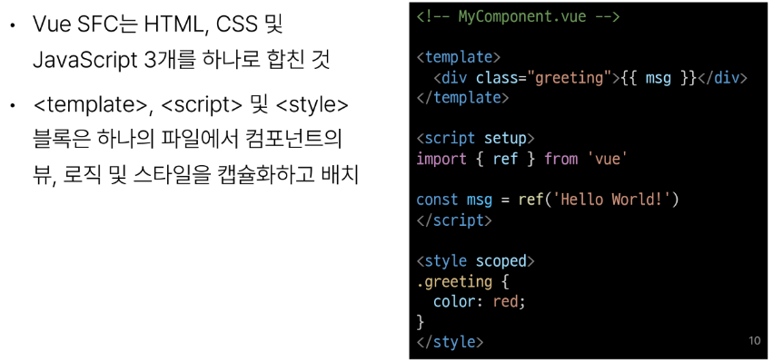 Single-File Components(SFC)란, 컴포넌트의 템플릿, 로직 및 스타일을 하나의 파일로 묶어낸 특수한 파일 형식(*. vue 파일)입니다.