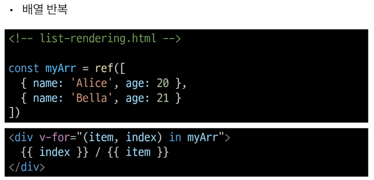 소스 데이터(Array, Object, number, string, Iterable)를 기반으로 요소 또는 템플릿 블록을 여러 번 렌더링 하는 함수입니다.