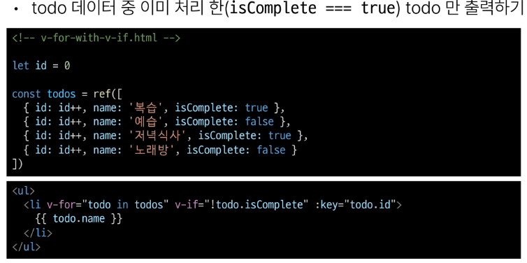 동일한 요소에 v-for와 v-if를 함께 사용하지 않습니다. 동일한 요소에서 v-if가 v-for보다 우선순위가 더 높기 때문입니다. 즉, v-if 조건은 v-for 범위의 변수에 접근할 수 없습니다.
