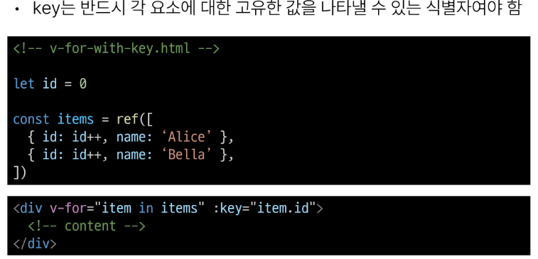 반드시 v-for와 key를 함께 사용해야합니다. 내부 컴포넌트의 상태를 일관되게 유지해야 하는데 즉, 데이터의 예측 가능한 행동을 유지(Vue 내부 동작 관련) 하기 위해서입니다.